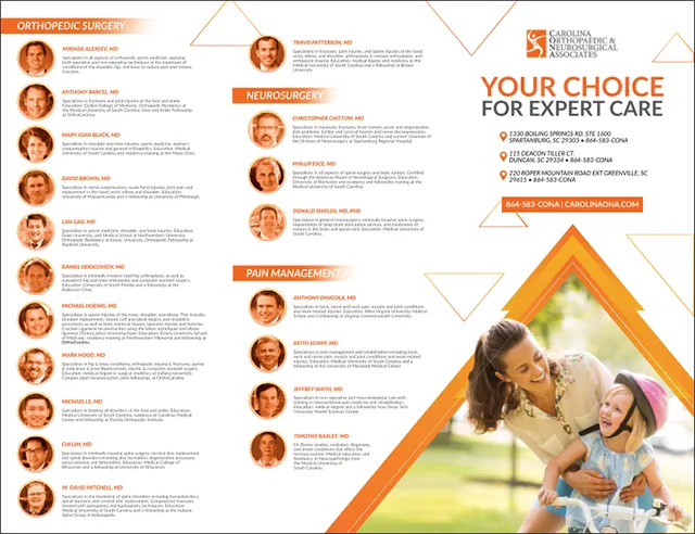 The physicians of Carolina Orthopaedic and Neurosurgical Associates (CONA) offer the most advanced training and experience in orthopedic surgery, neurosurgery, and pain management in the Upstate SC region. With Spartanburg, SC roots since 1962, our combined practice of orthopedics and neurosurgery is comprised of expert board-certified physicians treating a range of conditions with the latest in medical technologies.